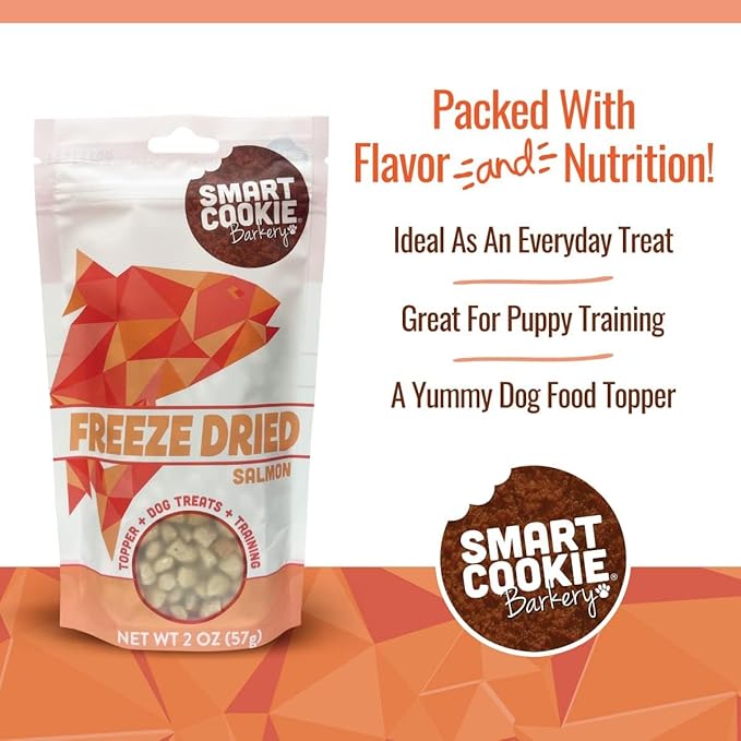 - WORRY FREE REWARD: Spoil your furry friend to something special with Smart Cookie’s Freeze Dried Salmon Bites! These freeze dried fish dog treats are packed with flavor and nutrition, making them ideal as an everyday treat, puppy training treats or as a dog food topper