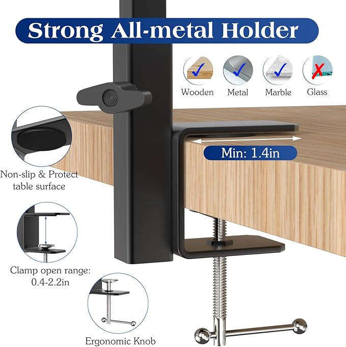 - Adjustable Dog Grooming Arm: This dog grooming arm can adjust the height based on the size of dog with screws. The maximum height from the desktop is 74cm/29in, which is applicable to small and medium dogs. Table clamp fits to 1-5.5cm/0.4-2.2in wood and marble table.