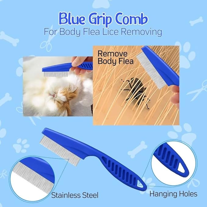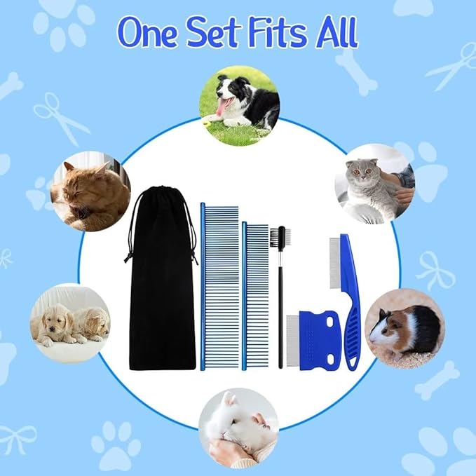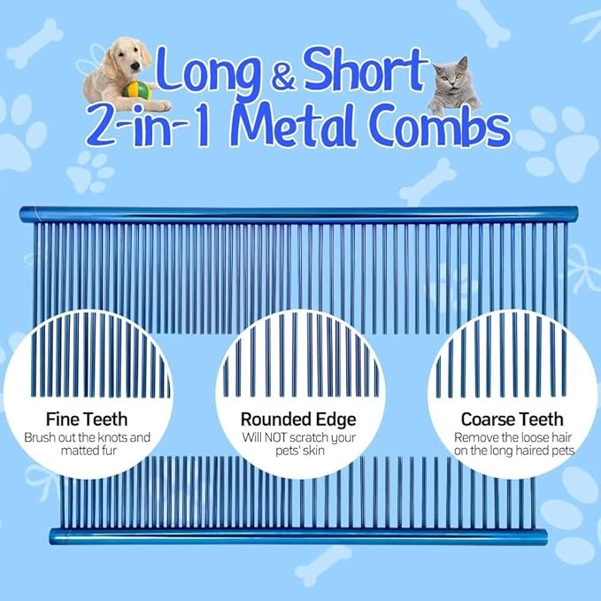 - Pet Grooming Combs Kit - Our pet grooming comb kit includes 5 different kinds of pet combs: tear stain remover comb x 1, long 2-in-1 metal comb x 1, short 2-in-1 metal comb x 1, blue short teeth comb x 1 and blue grip comb x 1 to meet different needs. Perfect for straightening out the knotted tangles hair, as well as finishing and fluffing.