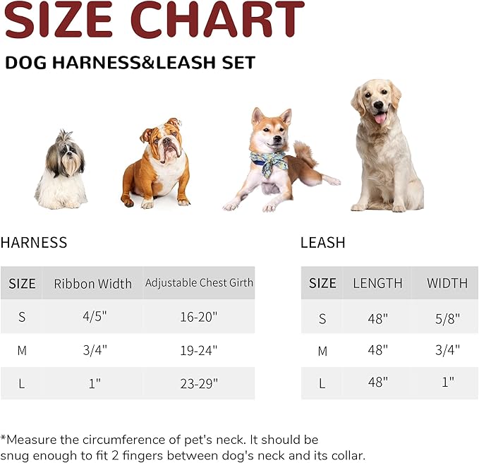 - [3 Sizes Option] No Pull dog harness and leash set are available in 3 sizes. Please measure your dog carefully according to the size chart before placing an order to ensure the collar fits your dog. Please leave room for your dog to rest, eat and chew