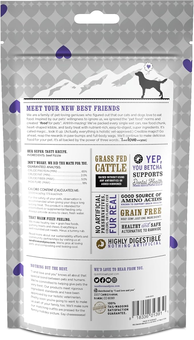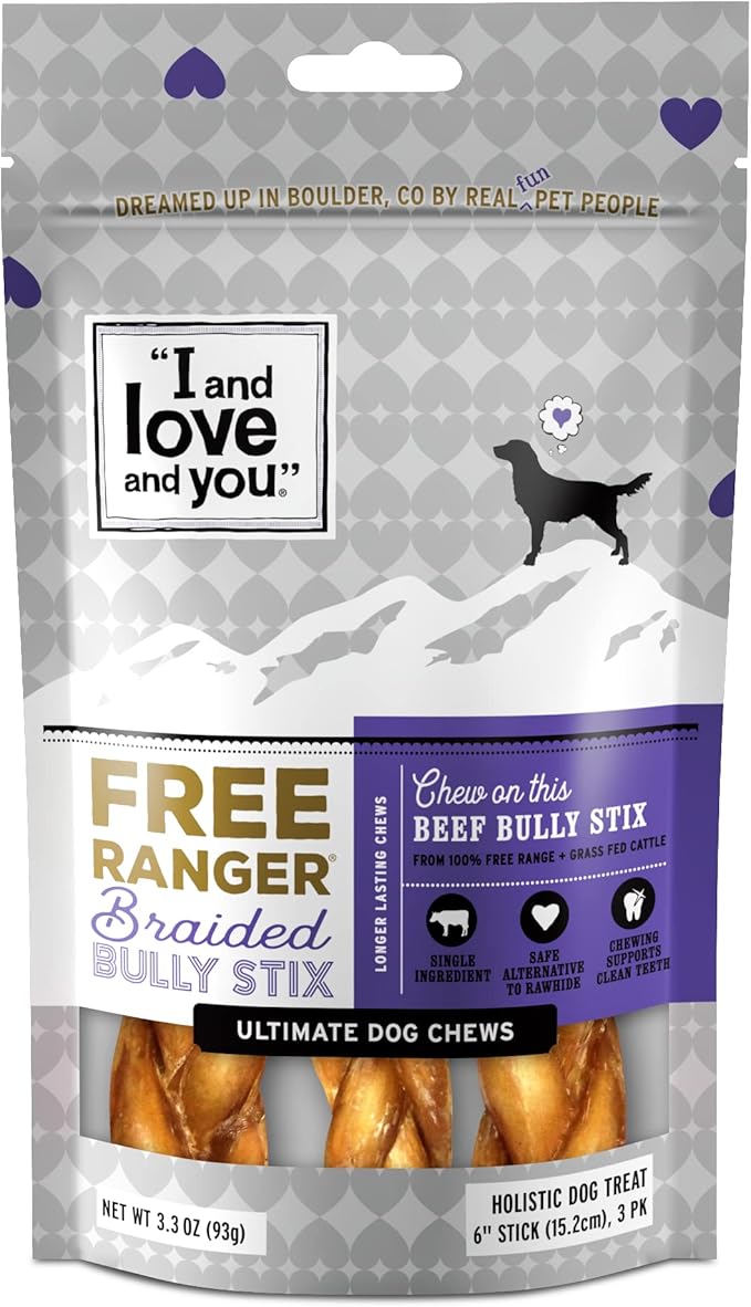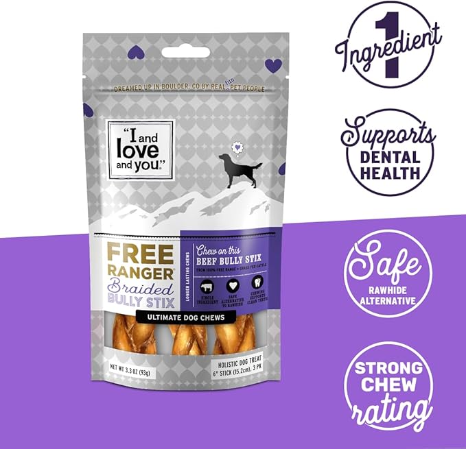 I AND LOVE AND YOU Free Ranger Braided Bully Stix - Beef - Rawhide Alternative, Single Ingredient, Free Range Grass Fed Beef, 6in, 3ct