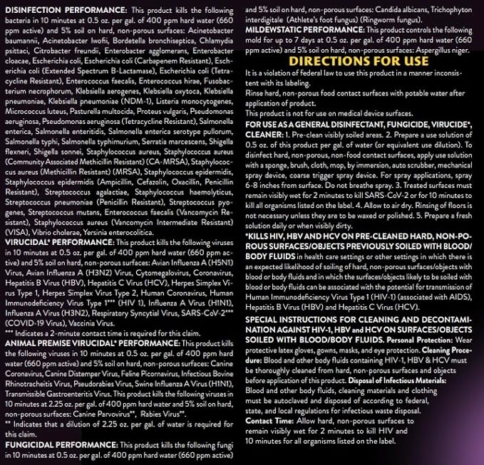 - Formulated for Use in Veterinary Clinic, Kennels, Grooming Salons, and other Animal Care Facilities - Kills Influenza Virus (H1N1) and (H3N2), Avian Influenza, Hepatits B and C, Canine Influenza, Salmonella, Parvo Virus, Staph, E. Coli, Bordetella Bronchiseptica, Adenovirus, Canine Distemper, Rabies, Herpes, and many more!