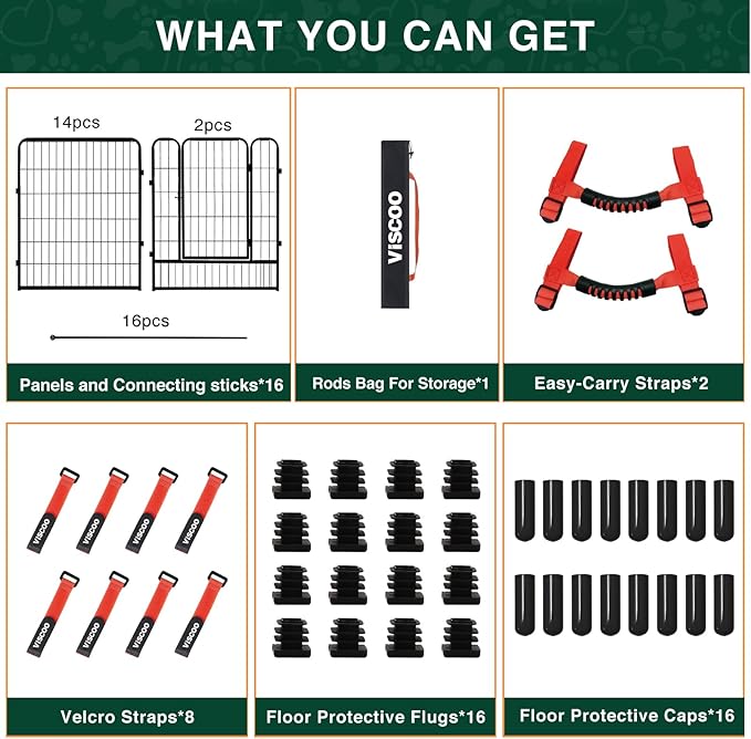 - ✔【Foldable for Multi-Occassions】This individual 16 panels pet playpen can be disassembled into a flat and compact size for easy storing or transport when not in use. Modular fence easy to set up within a few minutes under the detailed instructions.No tools required. Our camping dog fence is perfect for many occassions like RV camping, traveling, or for use in the yard.
