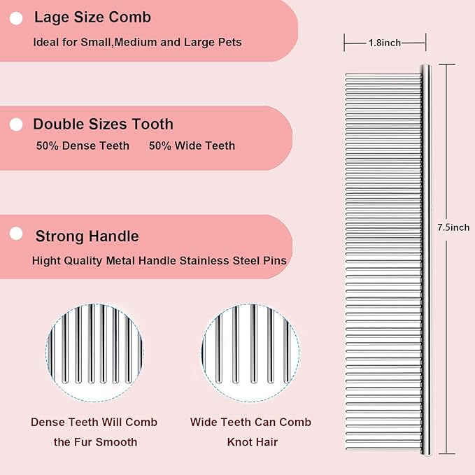 - 2 In 1 Stainless Steel Comb: Pet comb has high quality anti-static stainless steel round teeth that are strong enough, our dog combs for grooming features round teeth that break up tangles and effectively remove loose hair, dander dirt trapped beneath fur. dog comb naturally support the health of your furry best friend by boosting circulation