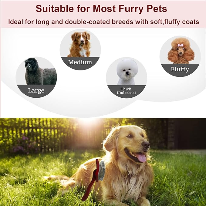- Ergonomic Handle and Cushion Pad: The dog grooming brush features ultra firm wooden handle with a comfort-grip and anti-slip surface, prevents hand and wrist strain.This doodle brushes for grooming has a retractable cushion pad that protects your pet's skin from being scratched by the brush's pins.Our dog brush for long haired dogs spares you the time and expense of visiting pet groomers