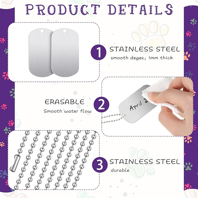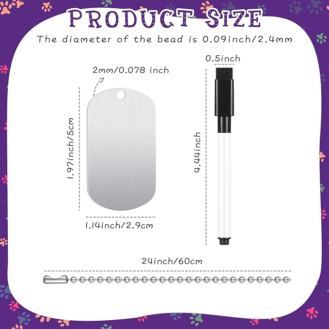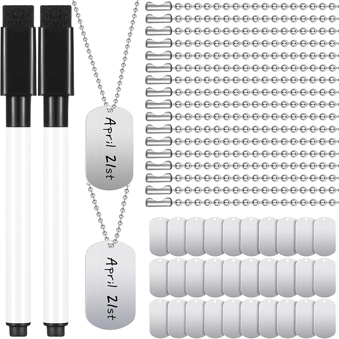 - Complete Set: the package contains 30 pieces of aluminum alloy blank dog tags, 30 pieces of 24 inch dog tag chains and 2 erasable black marker pens, which can be DIY designed into 30 different dog tag necklaces, share with your relatives and friend