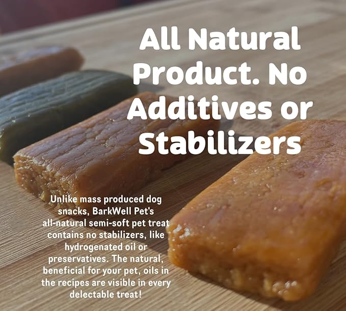 - HUMAN GRADE, USA MADE - BarkWell Protein Bars are gently mixed and formed with all-natural ingredients within a human-grade facility in the USA. Free from stabilizers like hydrogenated oil and preservatives, these semi-soft treats for dogs are never baked or dehydrated, ensuring your dog enjoys a fresh and natural snack every time