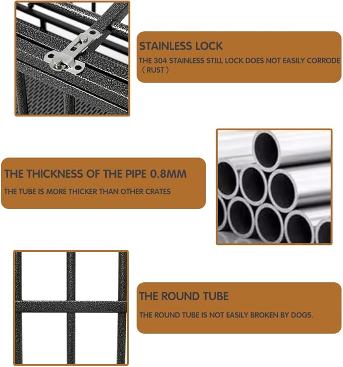 - 0.8mm pipe thickness And circular pipes:We are using thicker pipe to make the crate more solid. And the circular pipe make it difficul for the dog to apply sufficient bite force.