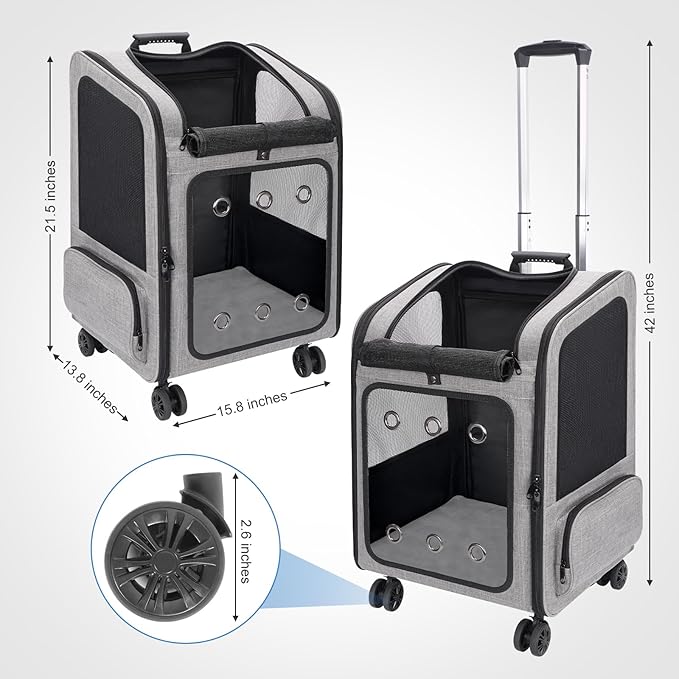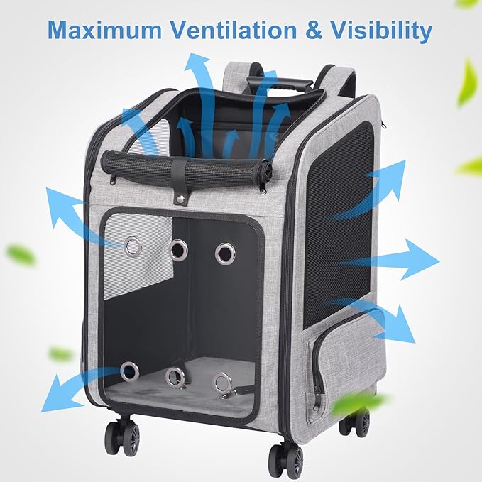 - SUPER LARGE SPACE: The cat backpack with wheels measures 15.8"L * 13.8"W * 21.5"H, the interior space is twice the normal size on the market, designed for large cats under 30 Lbs and small to medium dogs under 25 Lbs, allows your pet to move around more comfortably and reduces the anxiety