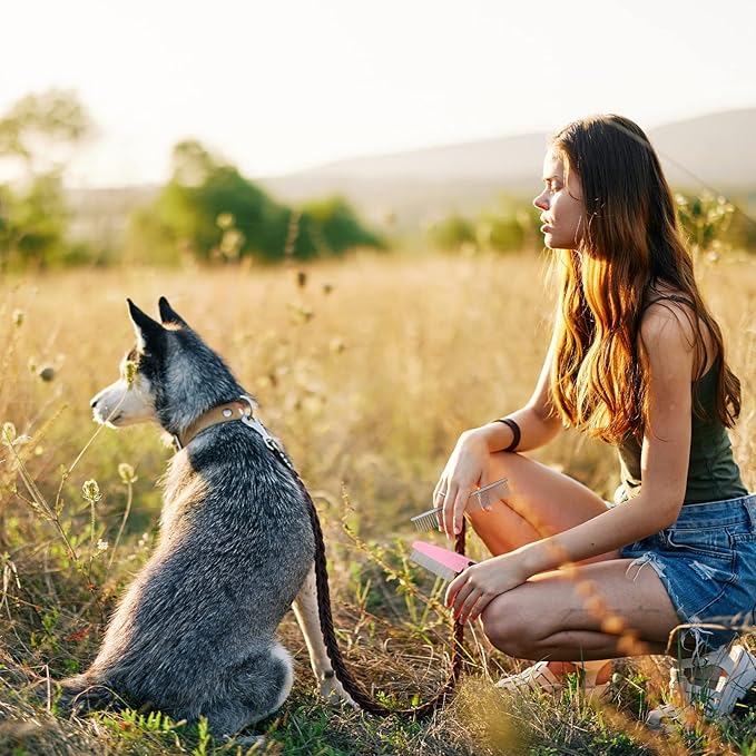 - grooming:Safe & efficient dog brush for dematting and deshedding; Our dog brush with fine rounded teeth for security; The silver brush comes in two tooth densities to handle stubborn mats and tangles for pets of different sizes and hair types, while The comb with handle has dense teeth and can be applied to remove floating hair, dust, impurities, fleas and so on from pet hair; the grooming can keep your home stay clean and tidy, especially in the pet hair losing season