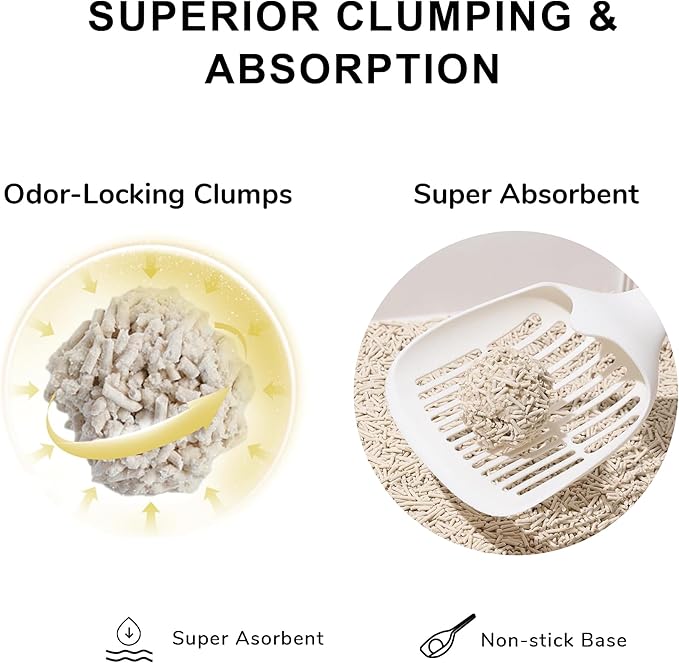 - Fast-Clumping & Flushable – 2-seconds absorption & 3-seconds cat litter clumping. The tofu litter forms tightly, clumps quickly, scoop easily because of its anti-stick feature. The cat tofu litter can be flushed away in the toilet, saving your time. (Reminder: Please do not flush too much litter once a time.)