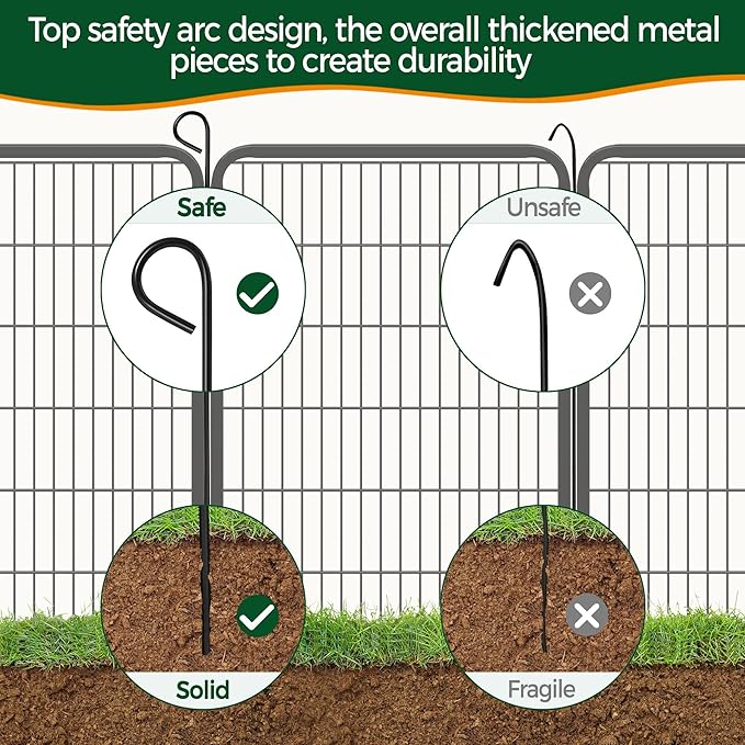 - Safe & Secure: Appropriate bar spacing keeps your pets safe in the exercise pen. Two latches on the door lock automatically as you close. Rounded edges protect animals, which also prevents causing damage to wood/PVC floors. Stakes not only connect the panels firmly but also anchor the panels to the grassland or soft ground