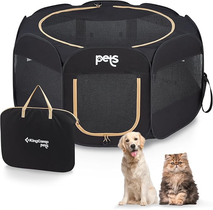 - 【Pop up & Foldable】You can pop up the pet playpen in a second without any tools. KingCamp premium pet playpen for small/medium dogs with self-stretching elastic band, easy to unfold and fold. Zippered outer pocket for easy carrying and storage. This convenient design can be used not only as an indoor puppy enclosure / pet crate at home. It can also be used as an outdoor playpen for pets when going camping, picnics, travel and other activities.