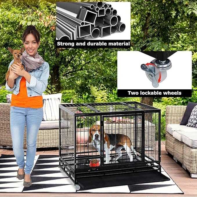 - ▲【LOCKABLE WHEELS】Our dog cage includes four rolling casters (two lockable) for easy transfer from room to room. Two wheels have locks to prevent accidental movement and keep your dog crate securely in place. The dog dog kennel provides a secure and convenient use in your daily life.dog kennel dog crate dog cage