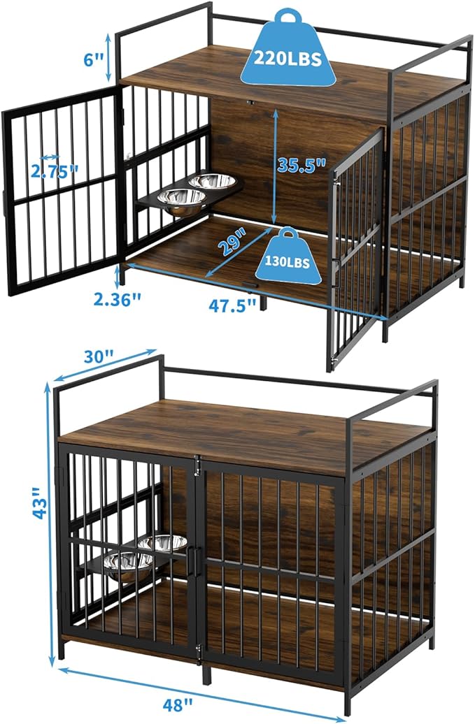 LOVMOR Dog Cage Furniture with Rotating Feeder Bowls, Dog Kennel Indoor with Cushion, Dog Crates for Large Dogs, 48" L X 30" W 43" H, Rustic Brown