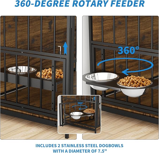- EASY FEEDING ??this dog kennel outside comes with a revolving door and 2 stainless steel dog bowls, which can be easily rotated 360° without entering the kennel to feed the dog, making meals easy and convenient. By the way, the height of the bowl can be adjusted up and down, suitable for dogs of all sizes to eat