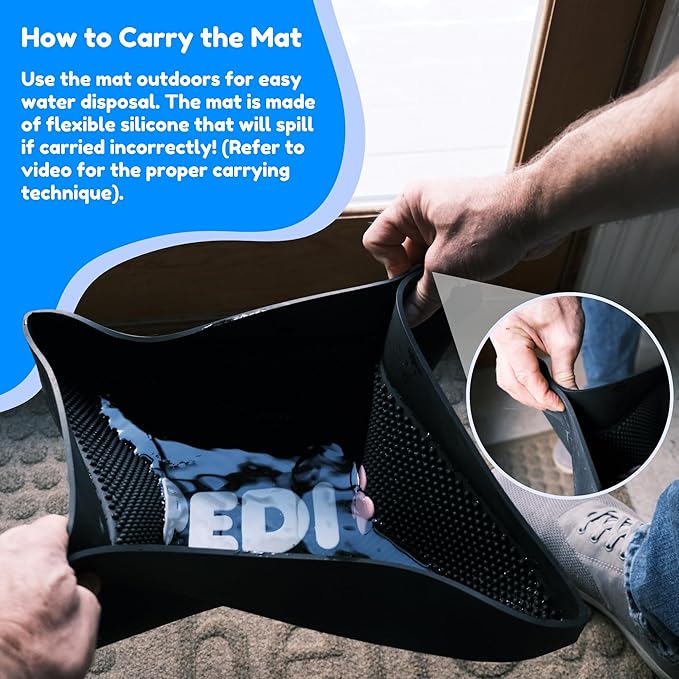 - Easy Cleaning After Use - Due to the flexible nature of the product, we recommend using PediPaw outside for easy water disposal. To carry and empty the mat without spilling, pinch opposite corners of the mat and bring together to create a bowl shape while lifting.