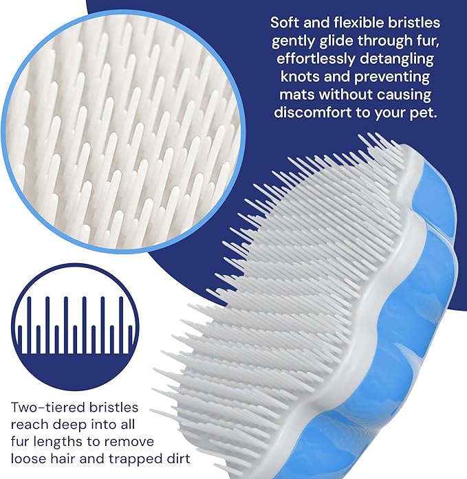 - Its unique bristle design and pattern calms pets while it gently unravels knots in hair and fur.