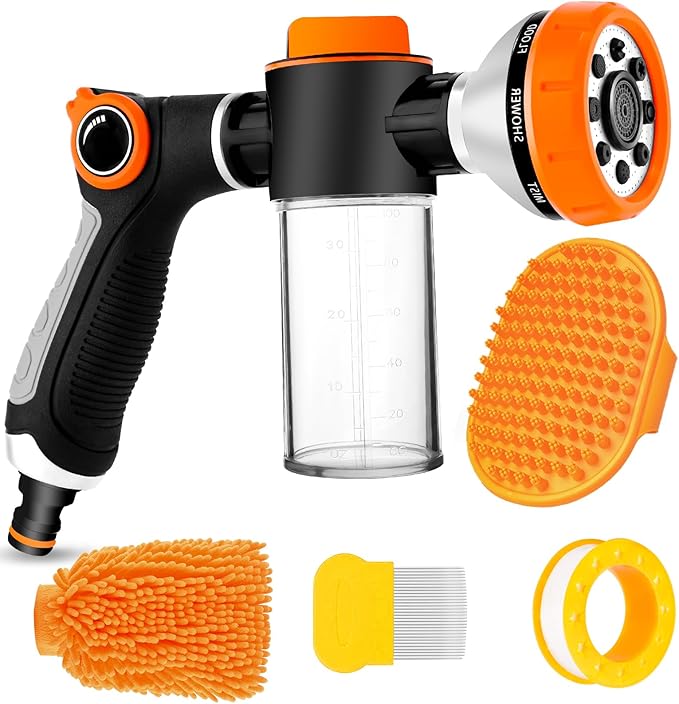 - Practical accessories: Extra dogs and cats tear stain remover grooming comb and pet rubber bathing comb brush. A nice set for giving your pet a bath. It's also a partical car wash hose attachment. Package includes 1 * hose nozzle, 1 * hose connector, 1 *washing mitt for car wash, 1 * pet grooming comb, 1 * pet bath brush, and 1 * PTFE Sealant Tape.