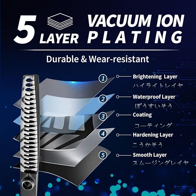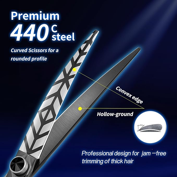 - Convex Blades: Each shear in this pet grooming set boasts arch blades that are hollow ground on the inside and ends in a tapered point. This design creates a smaller blade edge, reducing friction between the blades. And the hollow ground provides extra space, which effectively prevents hair from jamming or tangling within the blades. This feature not only ensures a seamless grooming experience, but also avoids unnecessary discomfort for your fluffy companion.