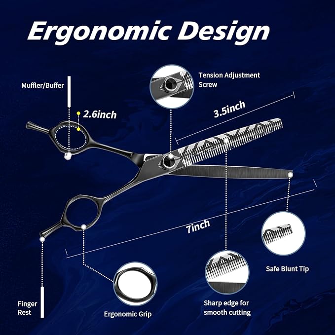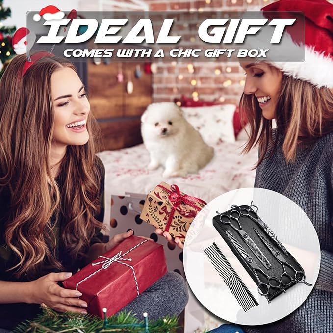 - All-in-one Groominng Set: Our comprehensive pet grooming set provides everything you need to keep your beloved furry friend looking their best. With 1*straight scissors, 1*curved scissors, 1*thinning scissors, 1*chunker, 1*zip case, and 1*stainless steel comb, you'll have all the tools necessary for a professional grooming experience right at your fingertips. With this set, you are able to trim, shape, create smooth edges, blend, soften, remove bulk, and detangle and fluff up the coat.