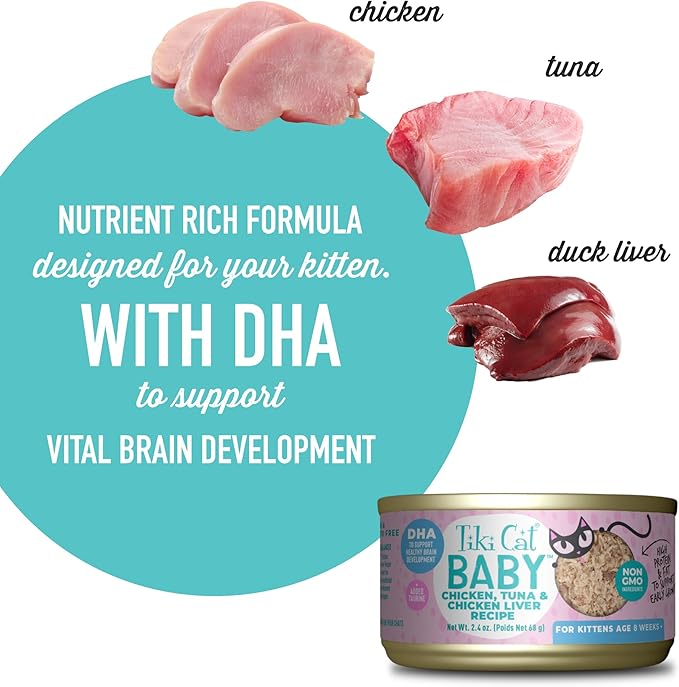 Tiki Cat Baby, Chicken Tuna & Chicken Liver Shreds, High-Protein and Flavorful, Wet Cat Food for Kittens 8 Weeks Plus, 2.4 oz. Cans (Pack of 12)