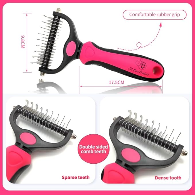 - DOUBLE SIDED DEMATTING BRUSH: Comes with 6 + 11 dematting teeth for thining and removing loose hair, use on side to effortlessly remove knots and mats on your pet and other side to thin and remove dander, loose hair and fur, keep your pet looking and feeling at their best.