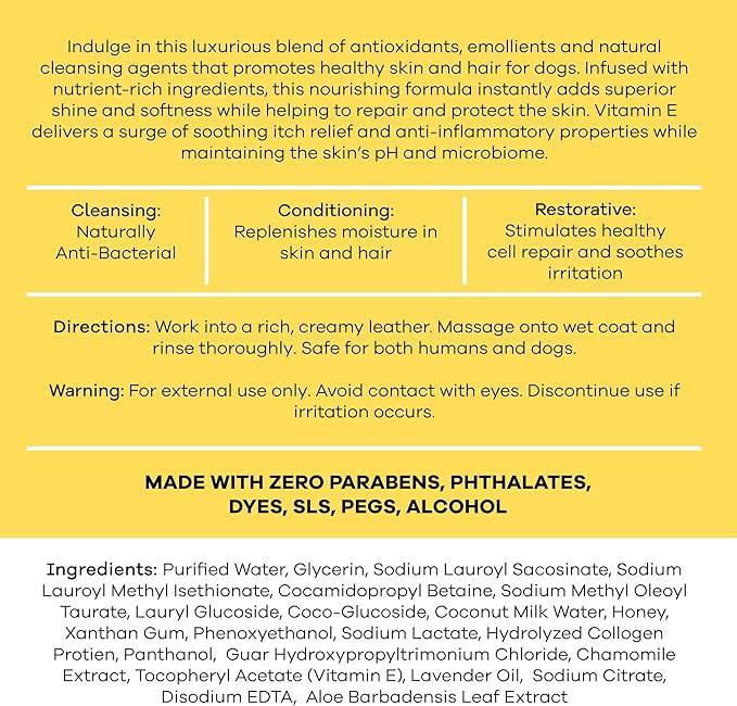 - Anti-Itch Relief: Alleviate discomfort for your dog with soothing Anti-Itch Shampoo & Body Wash. This comprehensive elixir includes Panthenol (Provitamin B5), Vitamin E, Coconut Milk, and Chamomile to bring gentle relief to itchy skin, perhaps agitated from low-quality shampoos or sprays. This strengthening blend has a pH level of 7, making it ideally balanced for delicate dog complexions. Look forward to a comforted pup with shiny, hydrated skin and coat.
