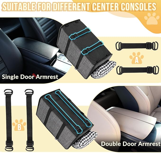 - 𝐒𝐮𝐢𝐭𝐚𝐛𝐥𝐞 𝐟𝐨𝐫 𝐃𝐢𝐟𝐟𝐞𝐫𝐞𝐧𝐭 𝐂𝐞𝐧𝐭𝐞𝐫 𝐂𝐨𝐧𝐬𝐨𝐥𝐞𝐬 --- The pet car seat's bottom straps can be attached horizontally or vertically to accommodate different car models. The elastic bottom straps secure the bag to the center console, and the doggie car seat also comes with an adjustable safety belt that connects to your dog's chest or back strap for added security