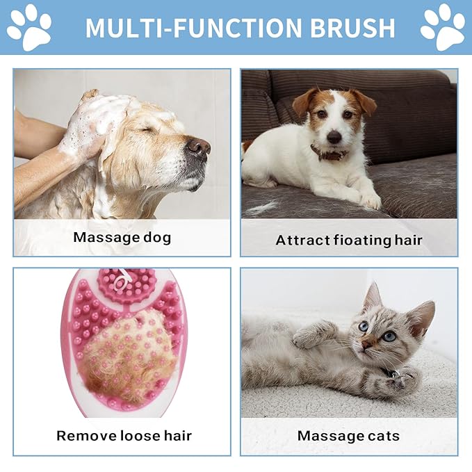 - 【High-Quality Material】The pet bath massage brush is made of soft silicone, and the soft and dense silicone bristles make pets feel comfortable when cleaning, which is more suitable for the pet's skin and can comb the pet's hair, remove loose hair and dust, and is easy to clean.