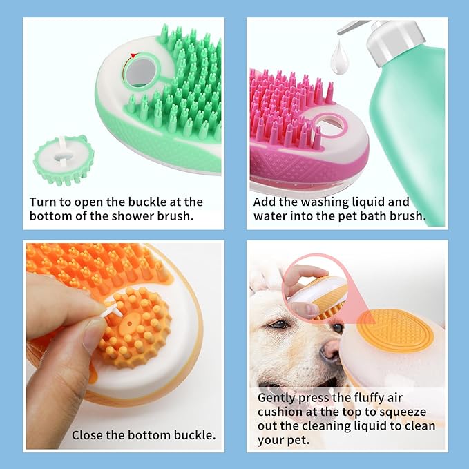 - 【Shampoo Distribution Design】The pet shower brush with a soap dispenser can add cleaning liquid to the card slot by turning the lock, and a small amount of shower gel can produce more foam. Gently press the fluffy air cushion, and the shower gel can easily flow out and be easy to clean.