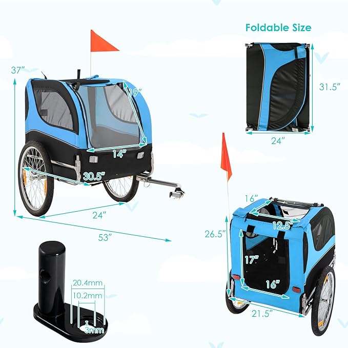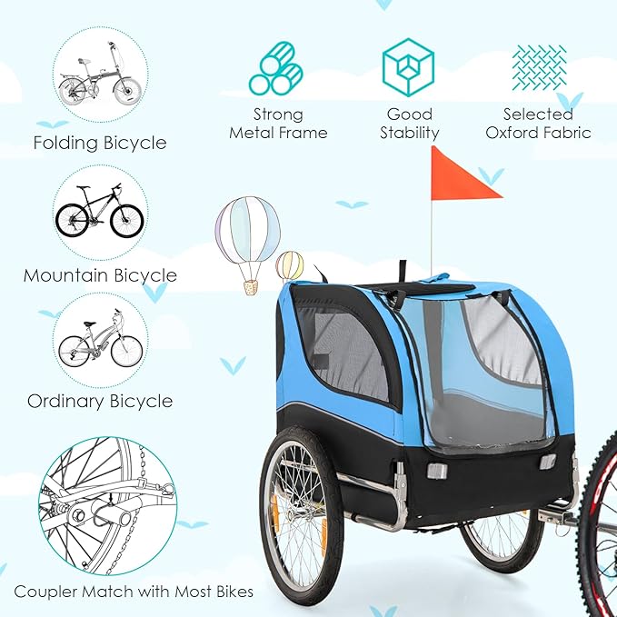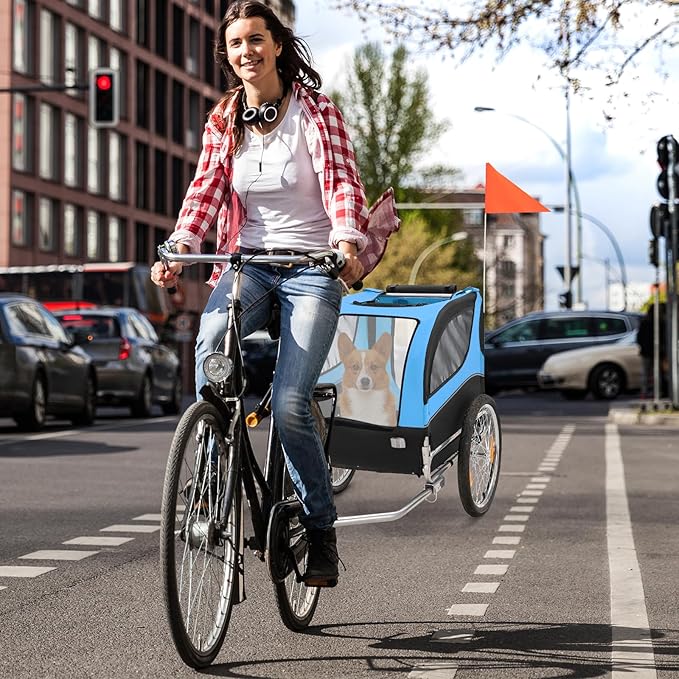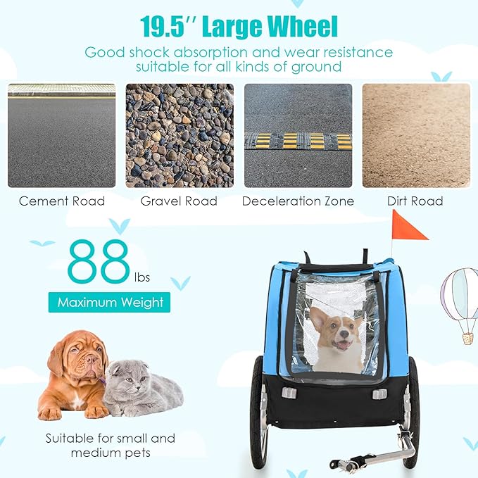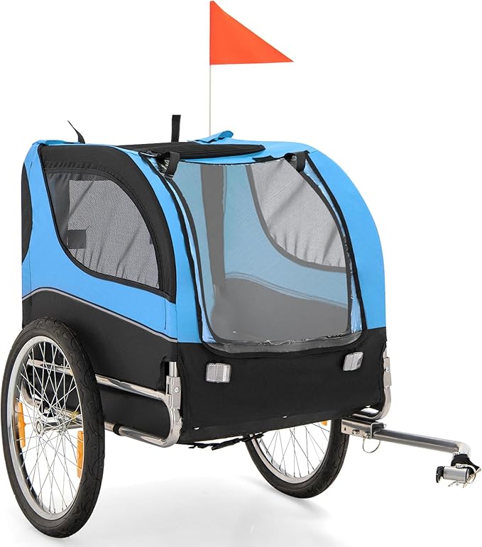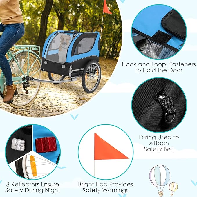 - Superior Safety Guarantee: The pet trailer is equipped with 8 reflector lights and 1 red safety flag. The bright colors will provide warning to surrounding vehicles and pedestrians, and improve safety when driving in low light conditions. In addition, there are D-rings inside the pet trailer that can be used to attach a safety rope to prevent your pet from falling.
