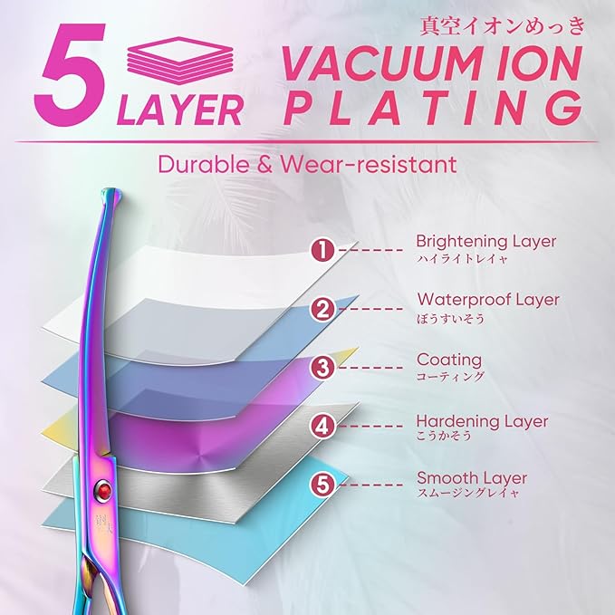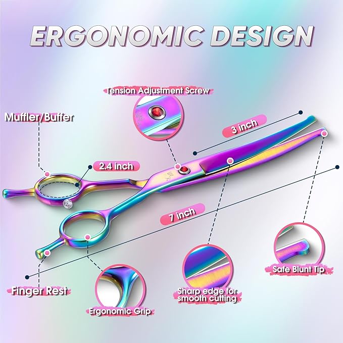 - Stunning & Unique Design: Our pet curved scissors feature a charming colors inspired by nature's rainbow. They add a touch of style and uniqueness to your pet grooming. Additionally, We prioritize the safety and well-being of your furry friend. The Safety Round Tips of our pet scissors minimize the risk of accidental nicks or cuts, ensuring a safe grooming experience.