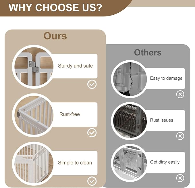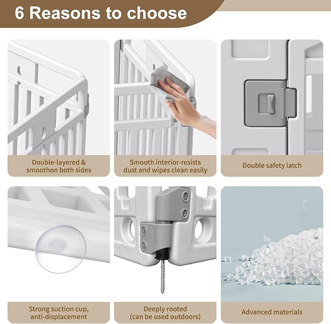 - SECURE AREA: Give your pet an entertainment space that belongs to it.Pet playpen tall enough for a small pet to reach into the enclosure, puppy playpen keeps your pets safe from others.Our pet fence is made of safe, high-quality plastic, and is artificially trimmed, smooth and burr-free, so You don’t have to worry about your pet getting hurt.