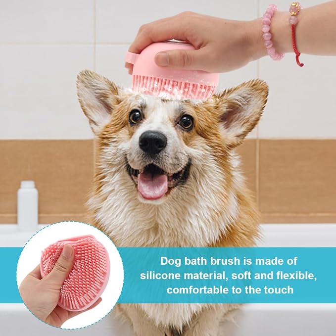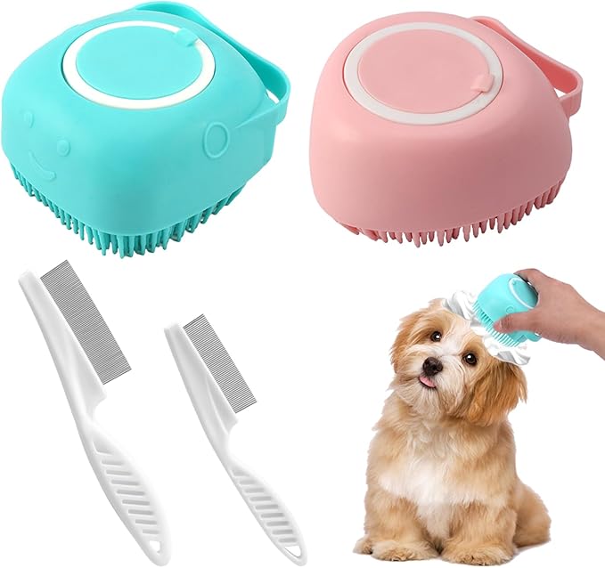 iayokocc 2Pcs Dog Cat Bath Brush Soft Silicone Dog/Puppy Massage Brush Hair Fur Grooming Cleaning Brush with Shampoo Dispenser,for Long Short Haired Pets,with 2Pcs Pet Flea Comb.