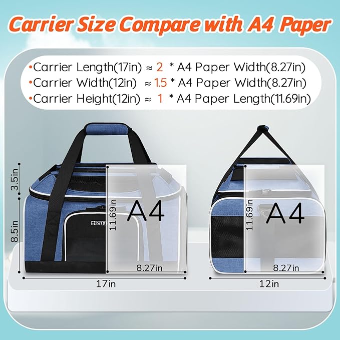 - 【AIRLINE APPROVED CARRIER 】Unfolded size:17"L×12"W×(8.5+3.5)"H, Petskd pet carrier is TSA approved and can be placed under the seat in the cabin, it is mainly designed for ①JetBlue Airlines:17x12.5x8.5"②Spirit Airlines:18x14x9"③Frontier Airlines:18x14x8", but also in compliance with ④Allegiant Airlines:19x16x9"⑤Southwest Airlines:18.5x13.5x9.5"⑥Air Canada:21.5x15.5x10.5". We recommend you buy this carrier when you fly with the above-mentioned airlines.