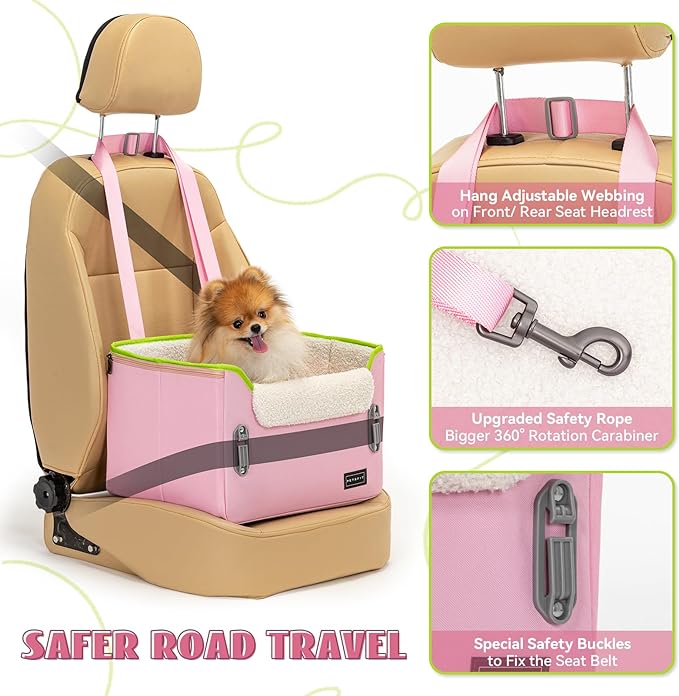 PETSFIT Small Dog Car Seat, Puppy Portable Dog Booster seat for Car with Clip-On Leash, Adjustable Straps Suitable for Small Pets Up to 25lbs (Pink)