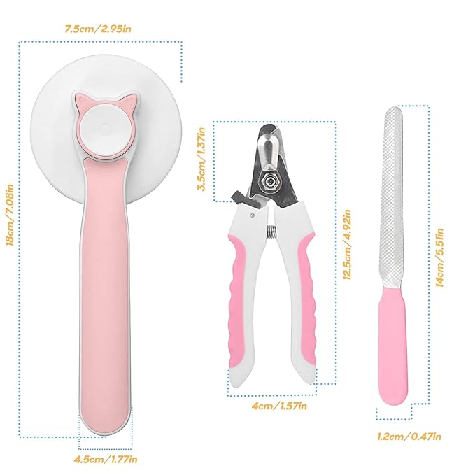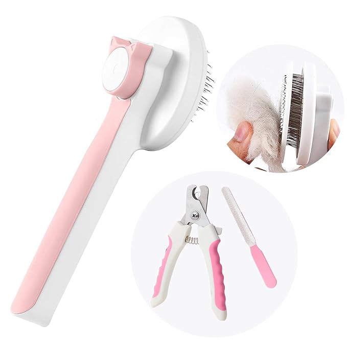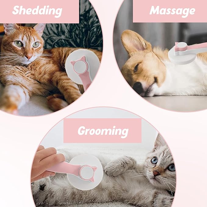 Grooming Brush with Release Button - Nail Trimmer, Hair Cleaner Brush for Shedding Long or Short Hair Cats and Dogs, Pet Massage Brush Pink