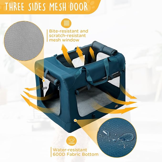 36 Inch Collapsible Soft Large Dog Crate, 3 Door Portable Dog Crates for Large Dogs, Soft Sided Dog Kennel with Chew Proof Mesh Windows, Dog House Indoor & Outdoor, Travel Dog Crate