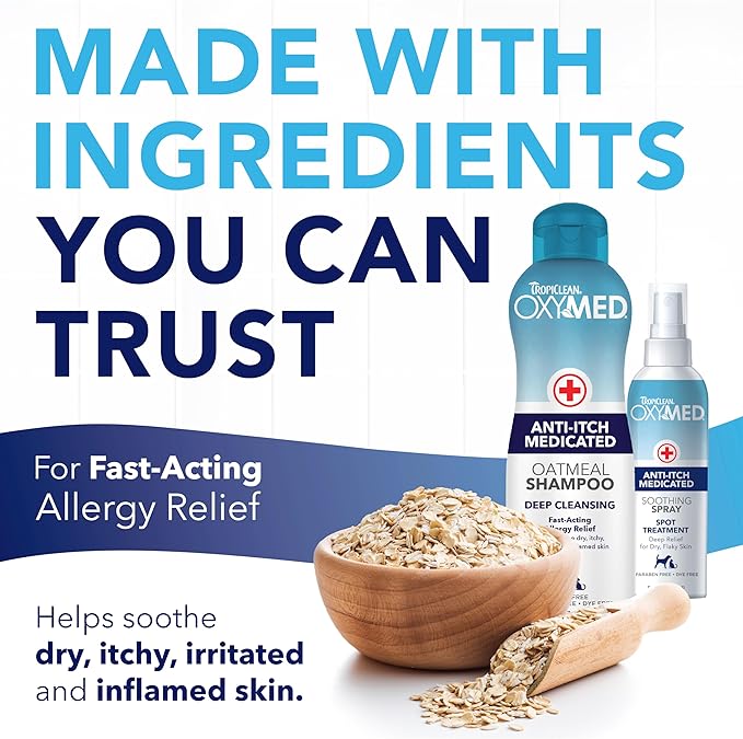 TropiClean Oxymed Cat & Dog Medicated Shampoo for Itchy Skin and Oxymed Medicated Itch Relief Spray Set, Skin Soothing Oatmeal Shampoo for Dogs & Cats | Set of 2