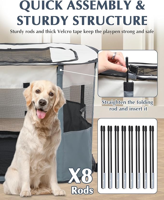 - 【DURABLE AND LONG-LASTING】 The pet fence is made from high-quality, thick mesh fabric and scratch-resistant 601D Oxford cloth, making it easy to clean. The seams and edges are reinforced for added durability and resistance to damage.