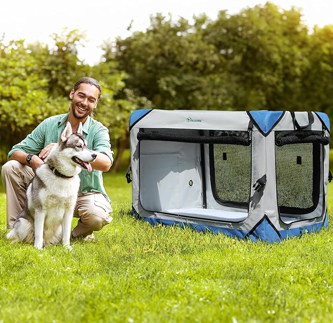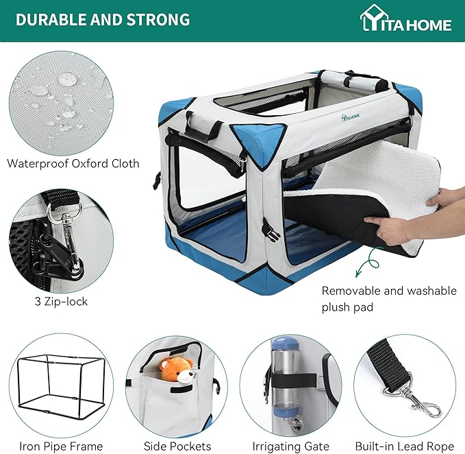 - ?�Sturdy and Durable?‘Designed with robust iron pipe kennel support bars, this collapsible dog crate offers exceptional stability and deformation resistance; Its side zipper closure will not prone to damage or jamming, effectively prevent dogs from climbing or scratching at higher areas; Pets are comfortably contained through the smooth operation of triple zipper-lock system.