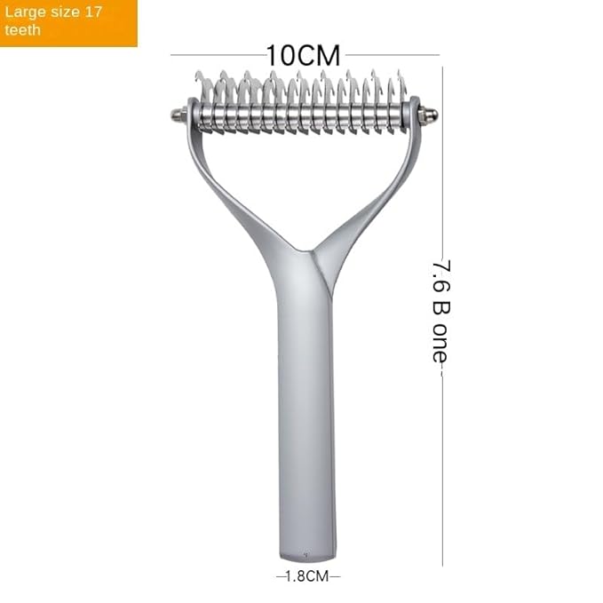 - DOUBLE SIDED DEMATTING COMB - Dematting comb with the 9+17precision teeth,That has a different number of teeth on each side.The lower density side is a dematting rake for stubborn matts and tangles. The higher density side is a detangler, deshedding tool, or undercoat rake for faster results thinning and to control shedding;No hurting or scratching