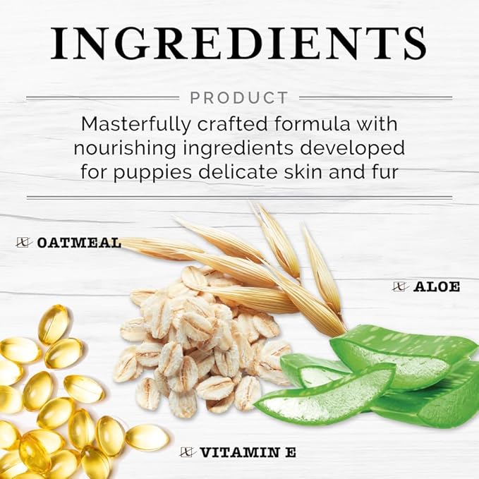 - SOOTHING ITCH RELIEF: The extra gentle formula is infused with nutrient-rich ingredients and botanical extracts. Calming Oatmeal, soothing Aloe and moisturizing Vitamin E combine to help relieve dryness, flaking and itchiness on your puppy’s sensitive skin.