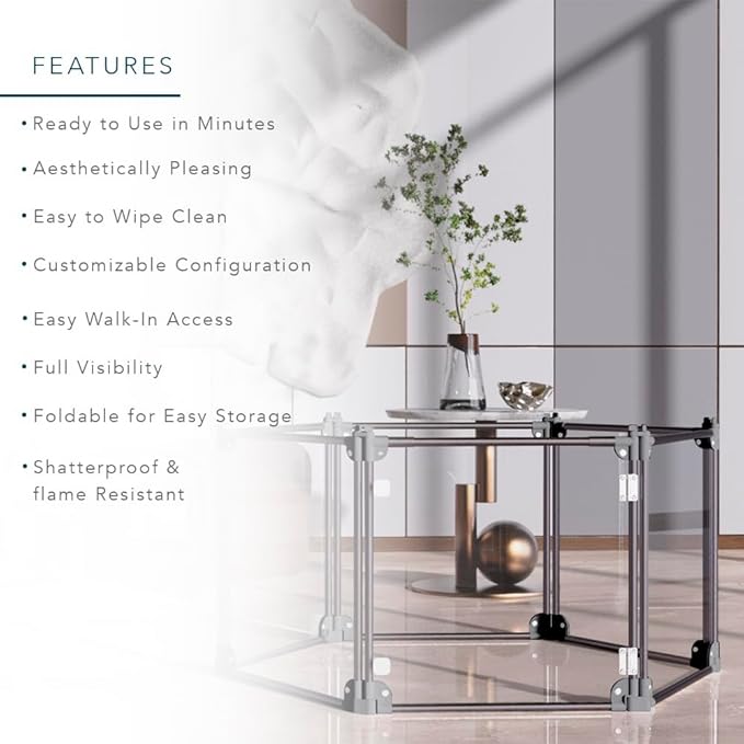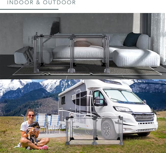 - MODERN & DURABLE DESIGN – Crafted with clear panels and sturdy rods, this dog fence blends seamlessly into any home. The durable materials ensure long-lasting use, making it a stylish yet functional indoor dog pen.
