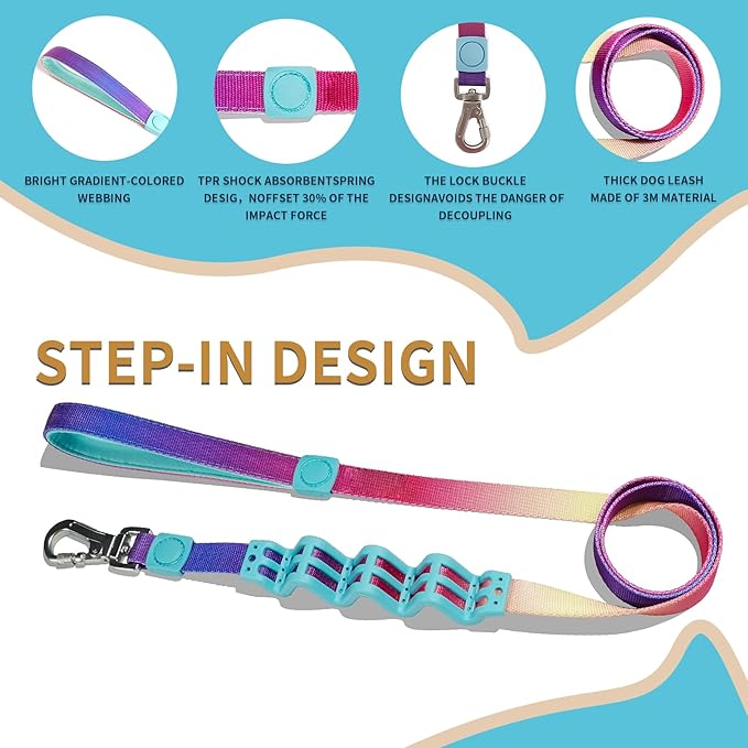 - Complete Walking Set: Elevate your small dog's walking routine with our all-inclusive set featuring a Tri-Color Dog Harness and a mesmerizing purple-pink gradient Shock Absorbing Dog Leash, This set ensures both style and functionality.