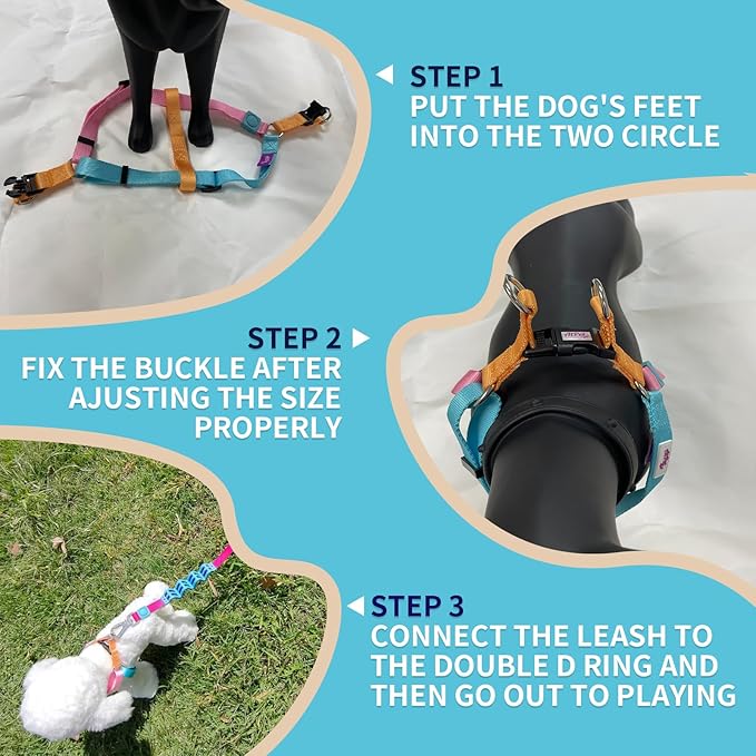 - Quality and Style: Crafted with durability in mind, both the harness and leash are built to withstand daily wear and tear. The tri-color design of the harness adds vibrancy, while the gradient leash showcases a unique blend of purple and pink hues, making your walks a stylish affair.