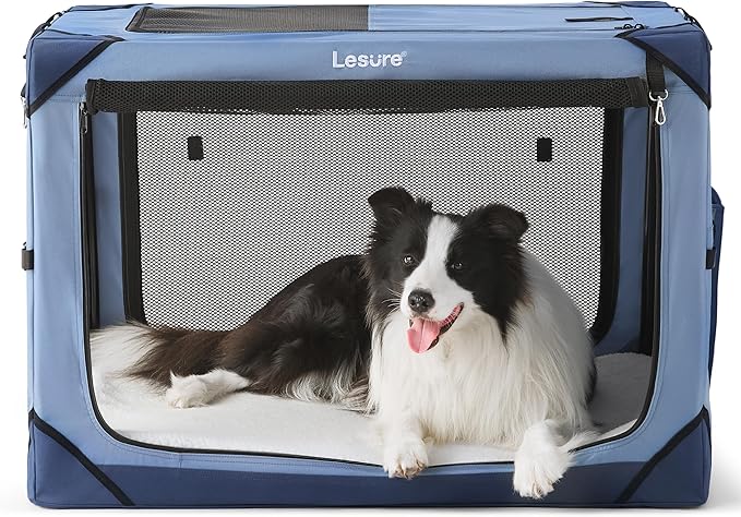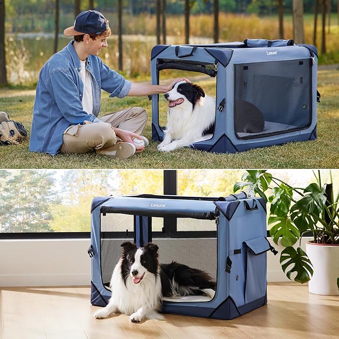 Lesure Collapsible Dog Crate - Portable Travel Kennel for Large Dog, 4-Door Pet Crate with Durable Mesh Windows, Indoor & Outdoor, Blue