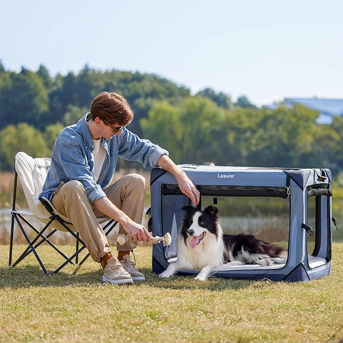 - Portable and Lightweight: The sturdy yet lightweight frame and fabric make this Large dog crate for car the perfect traveling home for your pooch. This indoor and outdoor dog kennel is equipped with a carrying handle and side pockets to conveniently store treats, leashes, waste bags, and other essentials.It even includes an elastic strap for a water bottle for dogs.