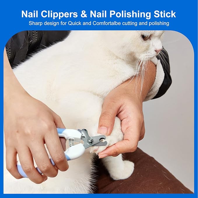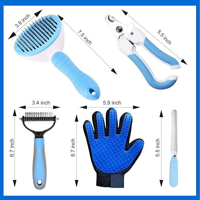 - 🐾 [5-in-1 Pet Kit & Portable] 5-in-1 Pet Kit neatly organized in a reusable zipper bag for on-the-go ease. Included: 1 self-clean slicker brush, 1 pet grooming rake, 1 pet nail clipper, 1 nail polish stick, and 1 upgraded grooming glove. Made of high-quality, wear-resistant rubber and stainless steel, these tools are not only durable but also easy to clean. Whether you're at home, in the park, or on the road, your pet's care is always at your fingertips.